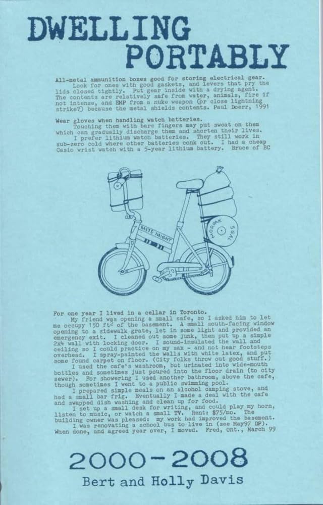 “Practical advice about low-budget motion by choice -- camping on the edges, living simply, getting by on the road and loving it. It's for modern nomads in the US choosing alternative lifestyles to working 9-5 in the same place. You get hard-won need-to-know wisdom like: How to live in cars. How to buy staples for 25 cents per pound. Can you camp in U-Hauls? Where can you find a cheap dentist? The dangers of social services taking kids without a house. Fixing a free bike for long-haul travel. etc.” - Cool Tools