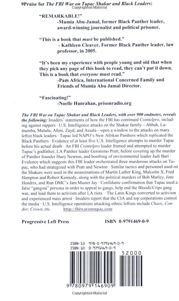 The FBI War on Tupac Shakur and Black Leaders contains a wealth of names, dates and events detailing the use of COINTELPRO style tactics by the FBI against a generation of leftist political leaders and leftist musicians. Based on 12 years of research and includes over 1,000 endnotes. Sources include over 100 interviews, FOIA-released CIA and FBI documents, court transcripts, and many mainstream media outlets. Book is 192 pages of main text, 100 pages of endnotes, 8 pages of photos (incl. government/court documents) and some more pages of preface, foreword, afterword, and bios.