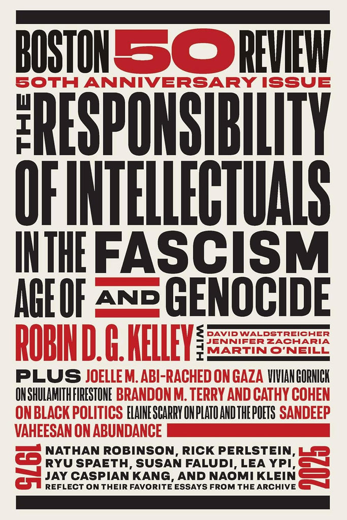 The Responsibility of Intellectuals in the Age of Fascism and Genocide is Boston Review’s 50th anniversary issue. This milestone issue features many of our longtime contributors, including Robin D. G. Kelley, Vivian Gornick, and Elaine Scarry, and celebrates classics from our archive.  In this issue, historian and Boston Review contributing editor Robin D. G. Kelley revisits Noam Chomsky’s landmark 1967 essay, “The Responsibility of Intellectuals,” published near the height of the Vietnam War. The essay’s dissident injunction—that those in privileged positions have a duty to “speak the truth and expose lies”—remains a powerful call to conscience, Kelley argues, but the anti-fascist and anti-colonial struggles of even earlier decades reveal its limits, and they show how to refuse and resist complicity in our own age of fascism and genocide. Political philosopher Martin O’Neill, Palestinian human rights lawyer Jennifer Zacharia, and historian David Waldstreicher expand on what this moment requires—of intellectuals, of journalists, and of us all.